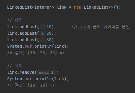 - ArrayList처럼 뒤로 밀거나 땡기는 연산없이 주소만 서로 연결시켜주면 되기 대문에 삽입/삭제가 빠르고 쉬움